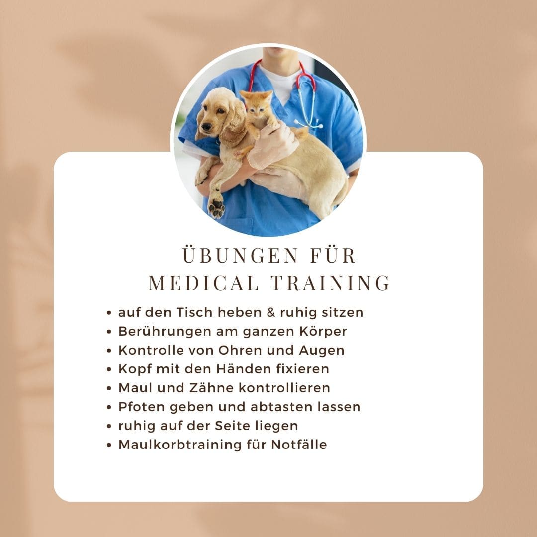 Viele Hunde zeigen deutliche Stresssymptome, wenn sie beim Tierarzt sind. Bereits im Wartezimmer merkt man die Anspannung unter den Vierbeinern. Kaum auf dem Tisch erstarrt dein Hund, zittert, knurrt oder schnappt sogar aggressiv? Medical Training ist nichts anderes, als dass du deinen Buddy an Gesundheitschecks, Körperpflege und Tierarztbesuche gewöhnst. Es bezeichnet eine gezielte Vorbereitung auf medizinische Prozeduren und Pflegemaßnahmen. Das Ziel des Trainings ist es, dass dein Vierbeiner Vertrauen fasst und Berührungen am Körper problemlos zulässt. Im Idealfall freut er sich sogar darauf, da er das Training mit Entspannung verbindet.