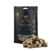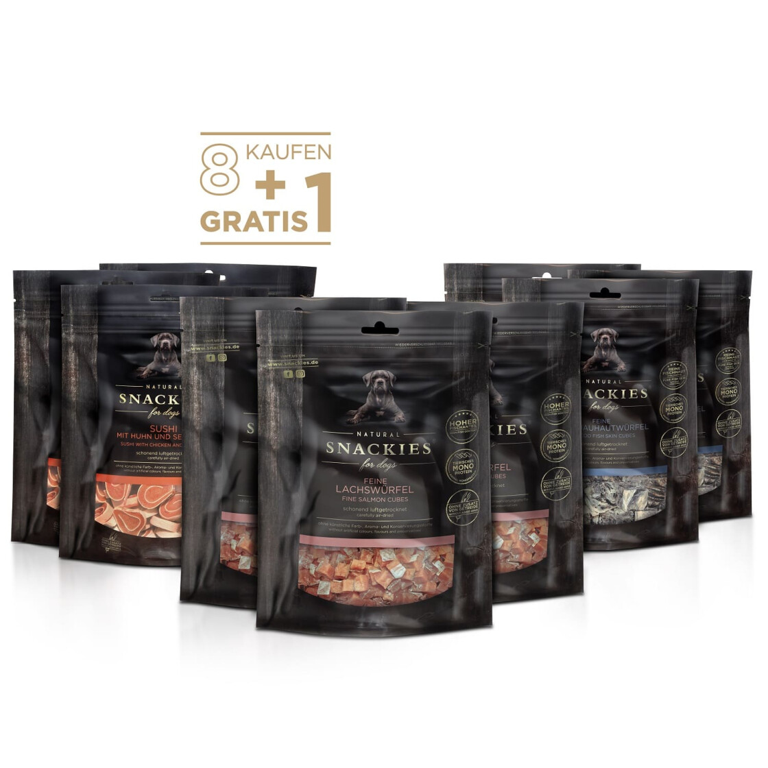 Lachswürfel: 85% Lachs, Erbsenprotein, Kartoffelstärke, natürliches pflanzliches Glycerin, Mineralstoffe