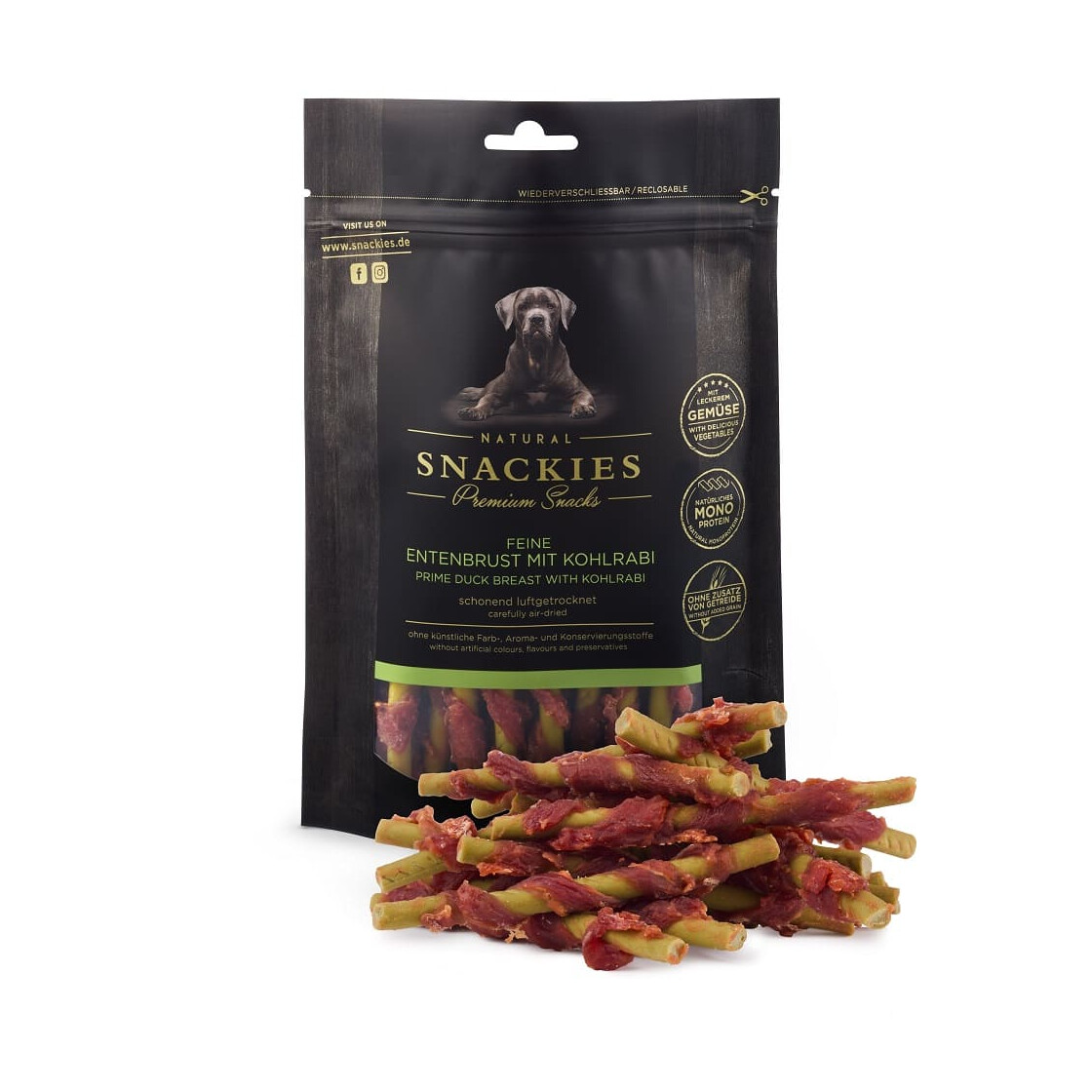 Entenbrust mit Kohlrabi: 52% Entenbrust, 25% Kohlrabi, Erbsenprotein, Kartoffelstärke, natürliches pflanzliches Glycerin, Mineralstoffe